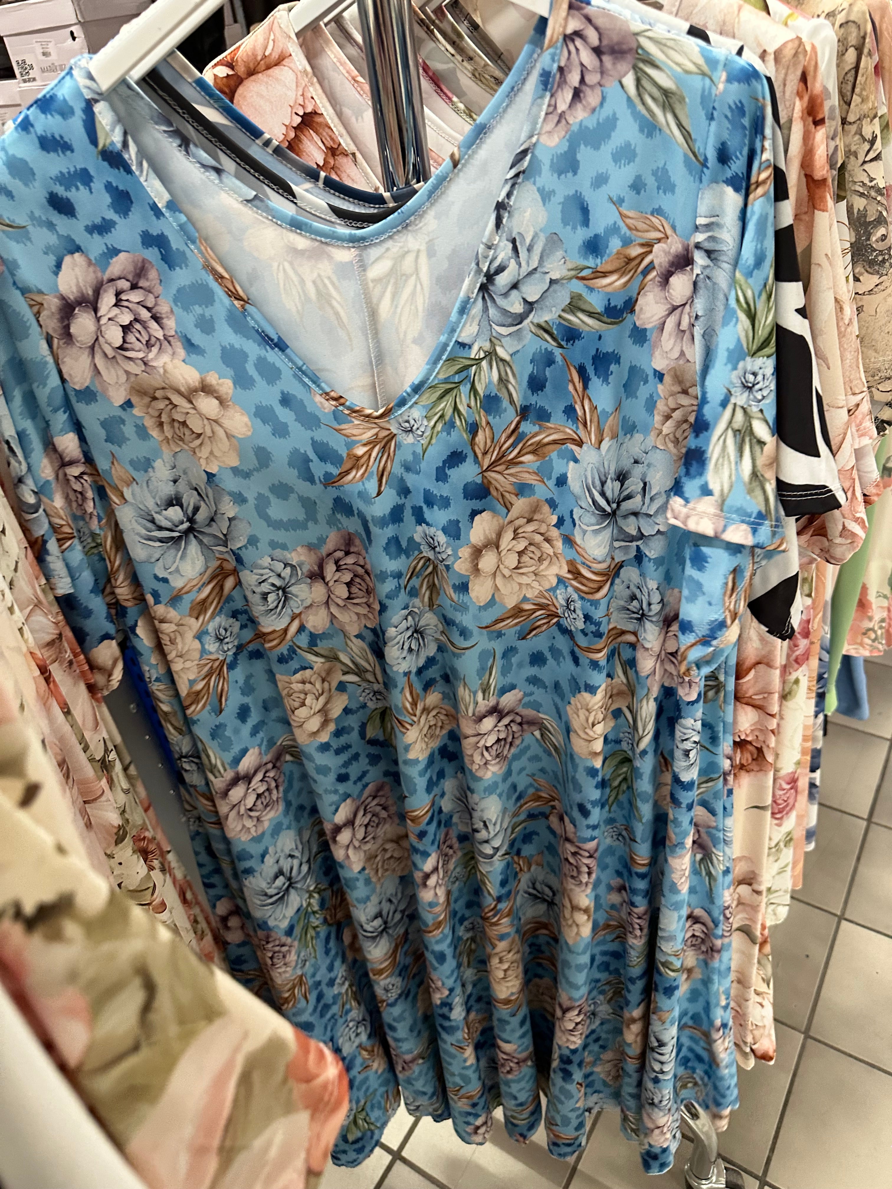 A-shape kjole med blå leo og blomster - Brystmål 130cm - Preorder