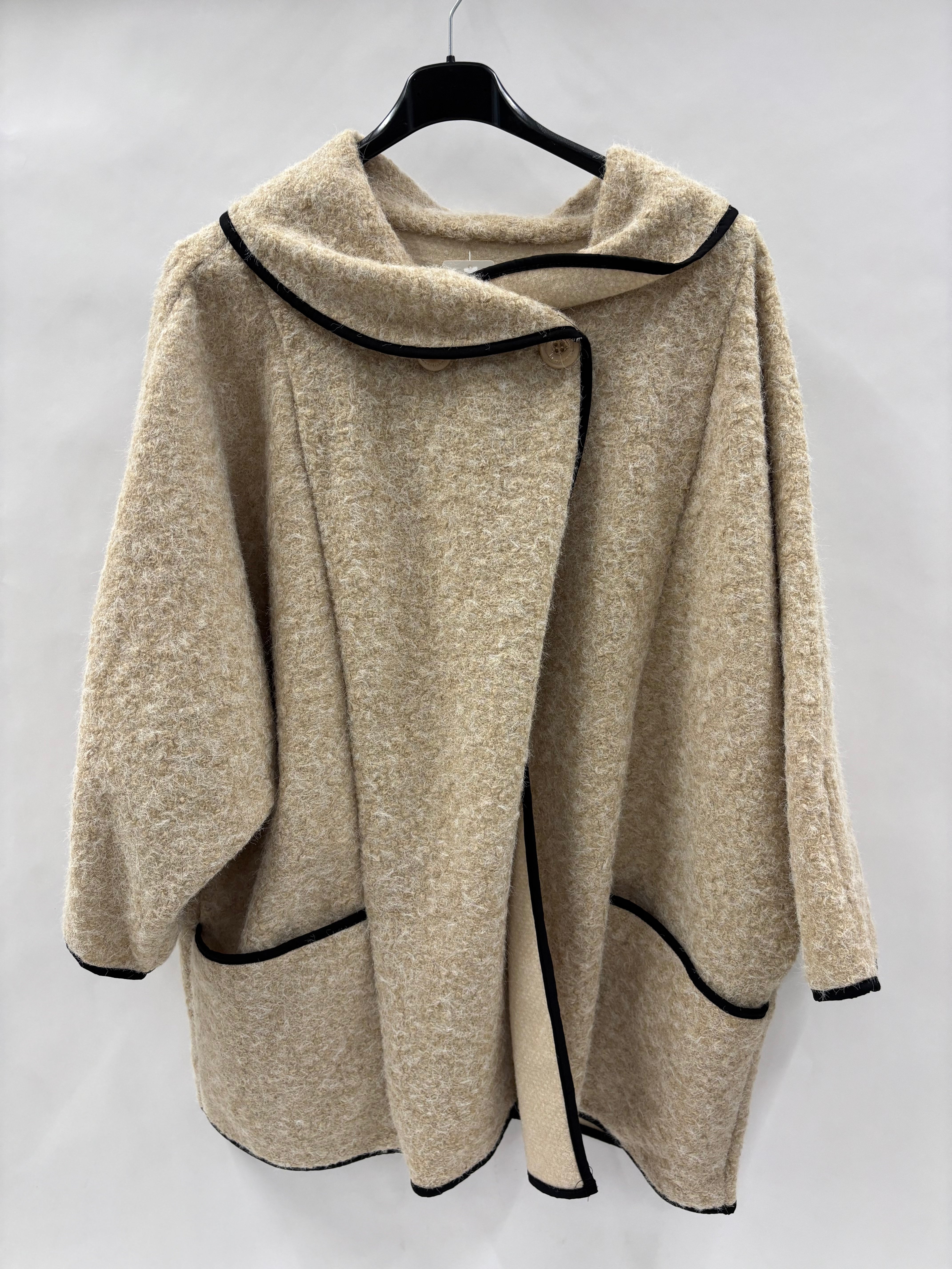 Stilfuld jakke med stor krave og praktiske lommer, der giver et moderne og gennemført look. De markerede kantbåndfremhæver designet og skaber flotte linjer, mens knapperne tilføjer et klassisk og elegant touch.