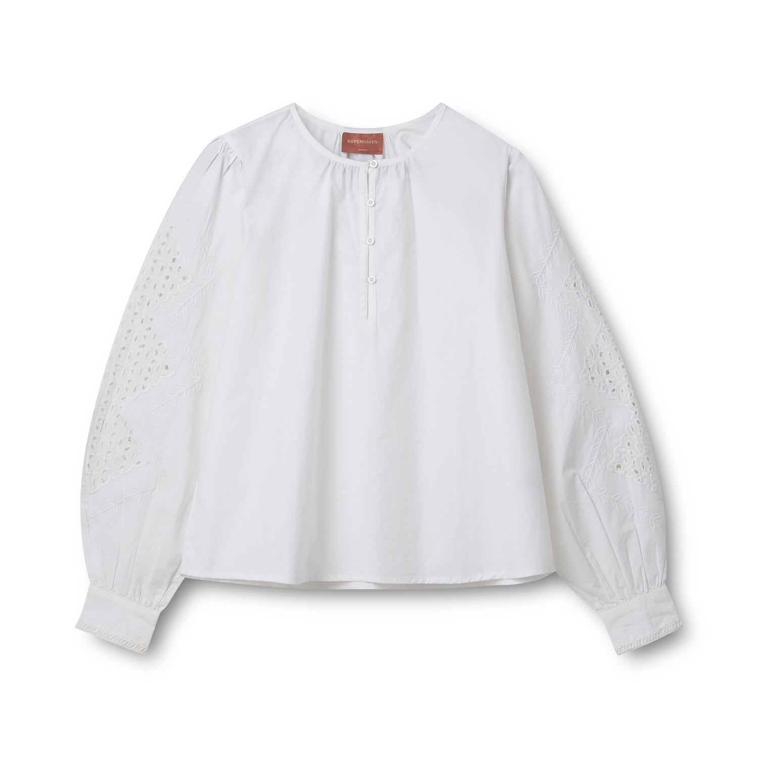 Agra Skjorte er en let og elegant skjorte i 100 % poplin. Den har klassisk knaplukning i halsen og fine blondedetaljer på ærmerne, som giver et feminint udtryk. Skjorten er både komfortabel og stilren.
