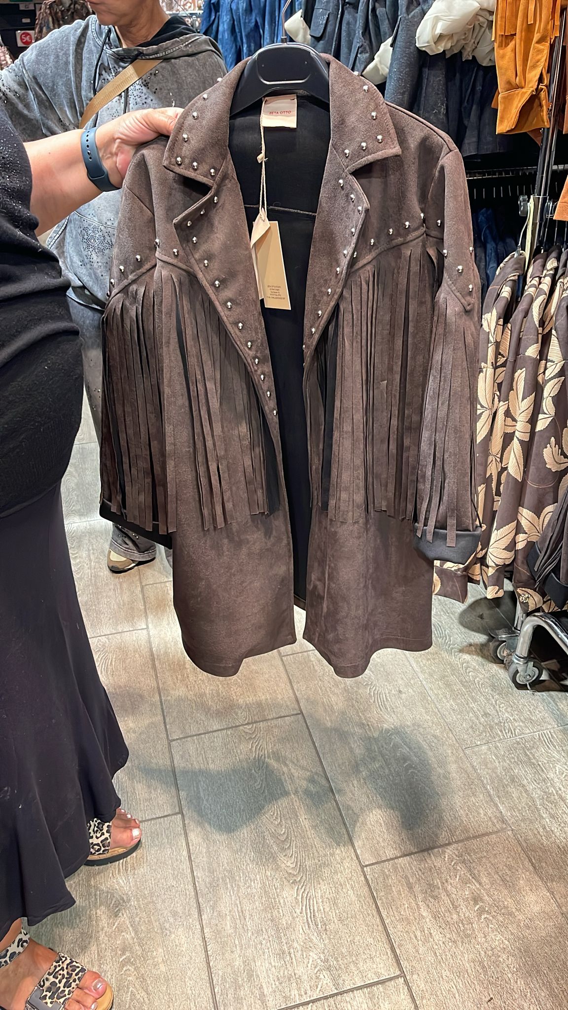 Ruskindslook frakke med frynser brun