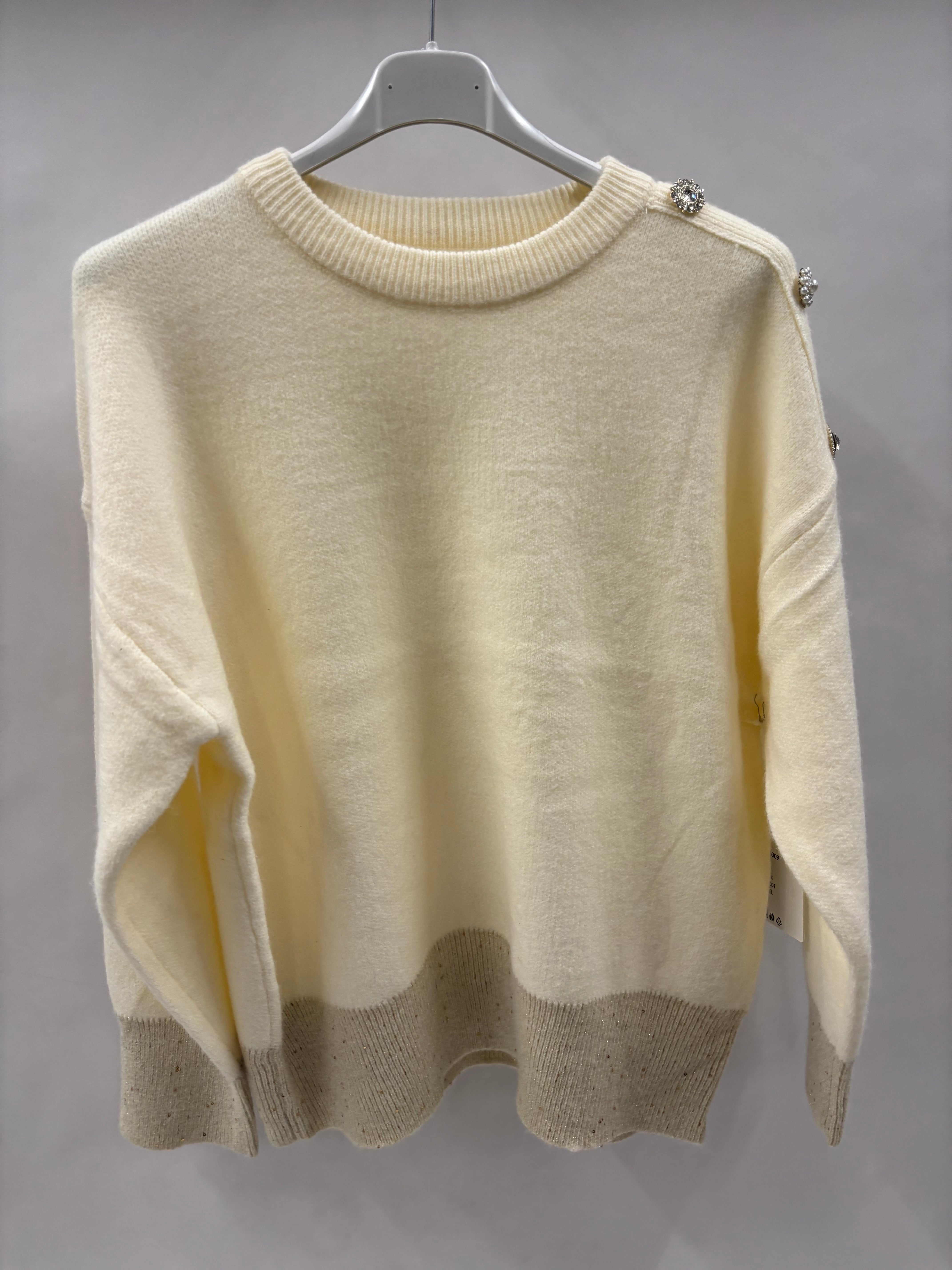 Striktrøje med perleknapper ved ærmerne Tilføj et elegant og feminint touch til din garderobe med denne langærmede striktrøje med perleknapper ved ærmerne. Det bløde og behagelige strikmateriale sikrer komfort hele dagen, mens de dekorative perleknapper giver et sofistikeret og stilfuldt udtryk. Trøjen er nem at kombinere med både nederdele, bukser eller jeans og passer perfekt til både hverdag og mere polerede outfits. En subtil detalje gør denne klassiske striktrøje til et standout-item i enhver garderobe. Fordele Blød og behagelig strik Perleknapper ved ærmerne for elegant detalje Langærmet og tidløst design Perfekt til både hverdag og festlige lejligheder